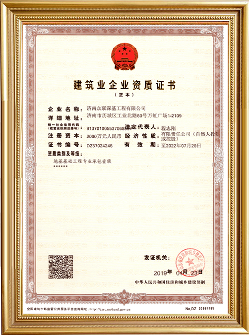 山東眾聯恒信工程集團有限公司成立于2010年4月20日,注冊資金2000萬元,固定資產8500萬元,公司主要從事地基基礎、勘察、設計等方面的專業承包,地基基礎專業施工資質壹級。